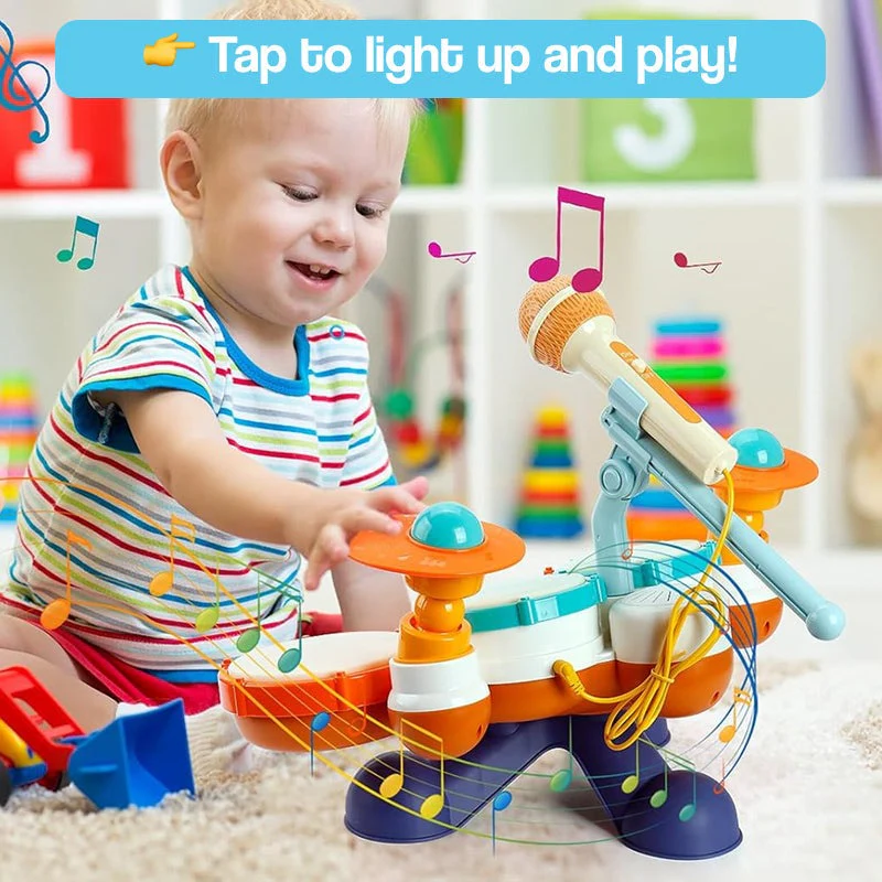 💡 Tap, Play, SingHit the drums and cymbals for lights and sounds. Try the piano keys or grab the mic for a mini concert!