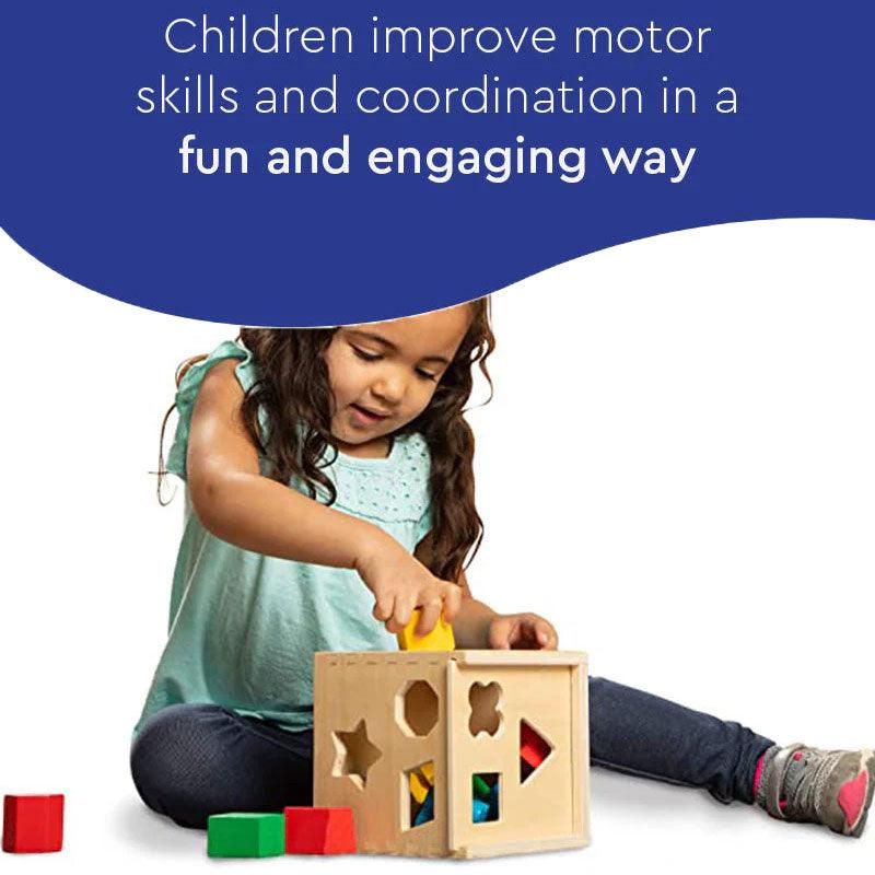 This ShapeSort Play Cube is a classic wooden cognitive educational toy featuring colorful blocks that fit into corresponding positions on the cube's five sides.